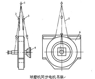 球磨機同步電機吊裝就位:在吊裝以前打開定子支腳上的鐵蓋,在支腳底板的螺孔內擰上4個M36的螺栓,使其露出底板下平面3mm左右。以備調整定子的高度。在球磨機同步電機定子的吊耳上再掛兩根繩扣。調整吊轉子的兩個5t手拉葫蘆使此4根繩扣同時受力,但定子繩扣受力大些,轉子繩扣受力小些,以保證轉子輕壓在定子上。