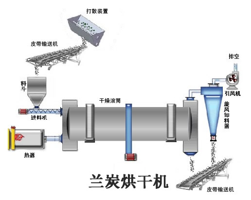 蘭炭烘干機設備由輸送機、沸騰爐(熱源設備)、烘干機主機、傳動裝置、進料裝置、支承部件(前托圈、齒圈、后托圈)、出料器、除塵設備、電氣系統等組成。