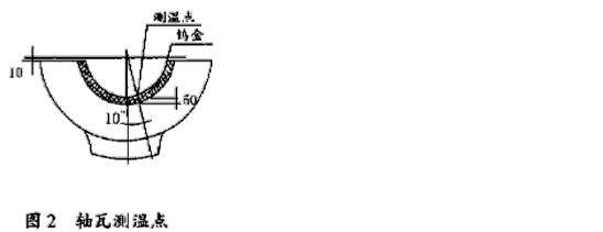 現有的磨機大多有溫度監控報警裝置,但其軸瓦溫度測點安裝在軸瓦鎢金層下方的鑄鐵件內,測點距鎢金底層約50mm。顯然,由于測溫點的溫度梯度通常為dT/dr=常數,也就是說,測溫點距軸瓦鎢金層越遠,溫度差也越大,測點距鎢金底層50mm遠時,其測試的溫度不能準確反映軸頸與軸瓦之間的真實溫度,比如:當測試溫度是50度時,軸頸與軸瓦之間的真實溫度可能是60度或以上,軸瓦勢必發生燒損。其改進辦法就是將測溫點安排在軸瓦承載區的鎢金層內,如圖2所示,經試驗其測溫準確,當濕度升高到報警溫度時,停磨檢査,未發現燒瓦現象。